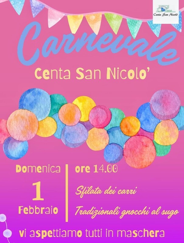 Karneval in Centa San Nicolò: Umzug der Wagen und Snack mit den traditionellen Gnocchi in Soße! Ab Uhr: 14:00 Ort: Parkplatz Feuerwehr und Festbereich in Centa San Nicolò Info: APT Alpe Cimbra 0464724130 oder info@alpecimbra.it