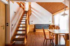Apartment with balcony, pull down double bed, equipped kitchenette, bathroom with shower and mansard floor with two single beds.