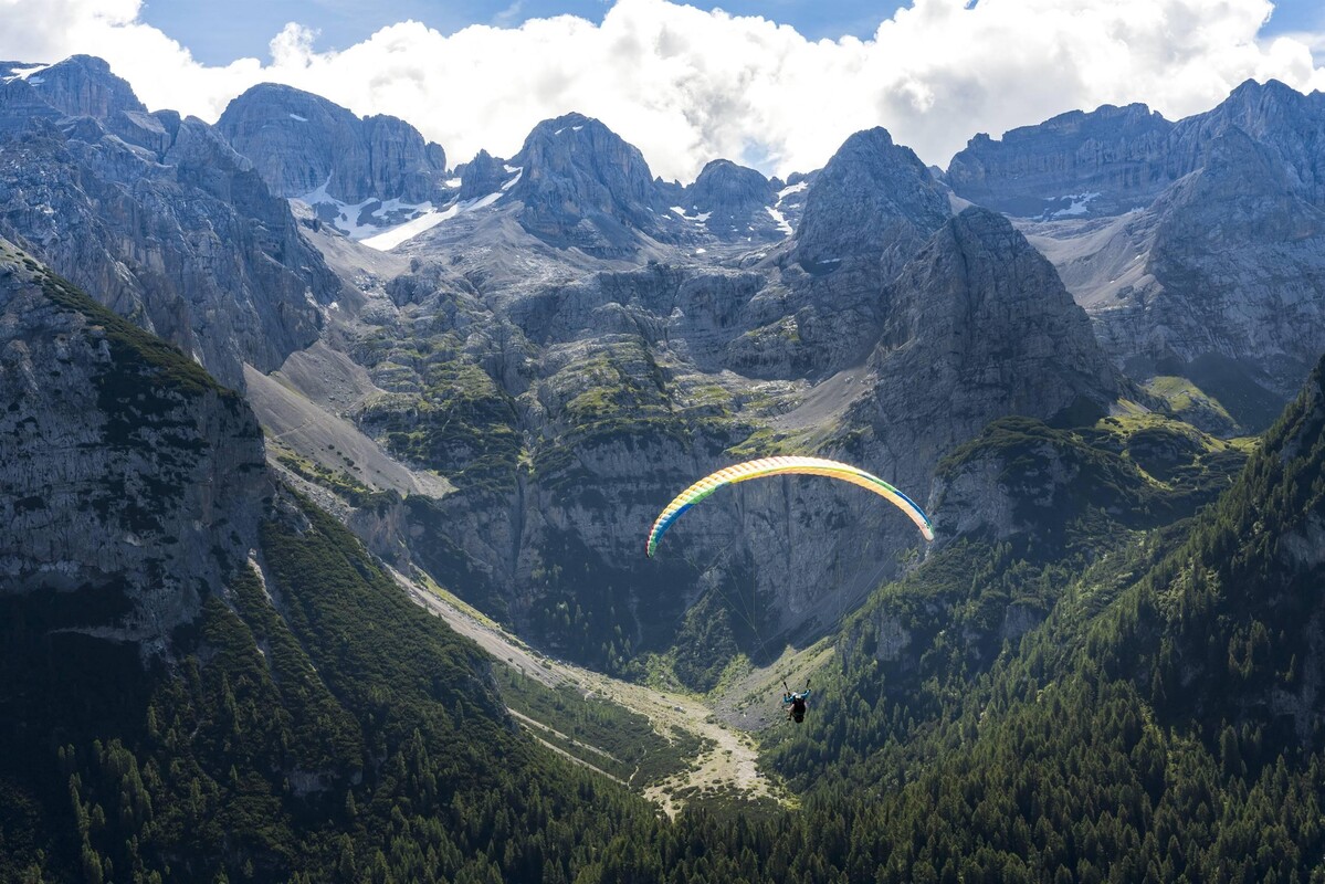 Experience the unique thrill of a tandem paragliding flight, an unforgettable adventure among the breathtaking peaks of the Dolomites!