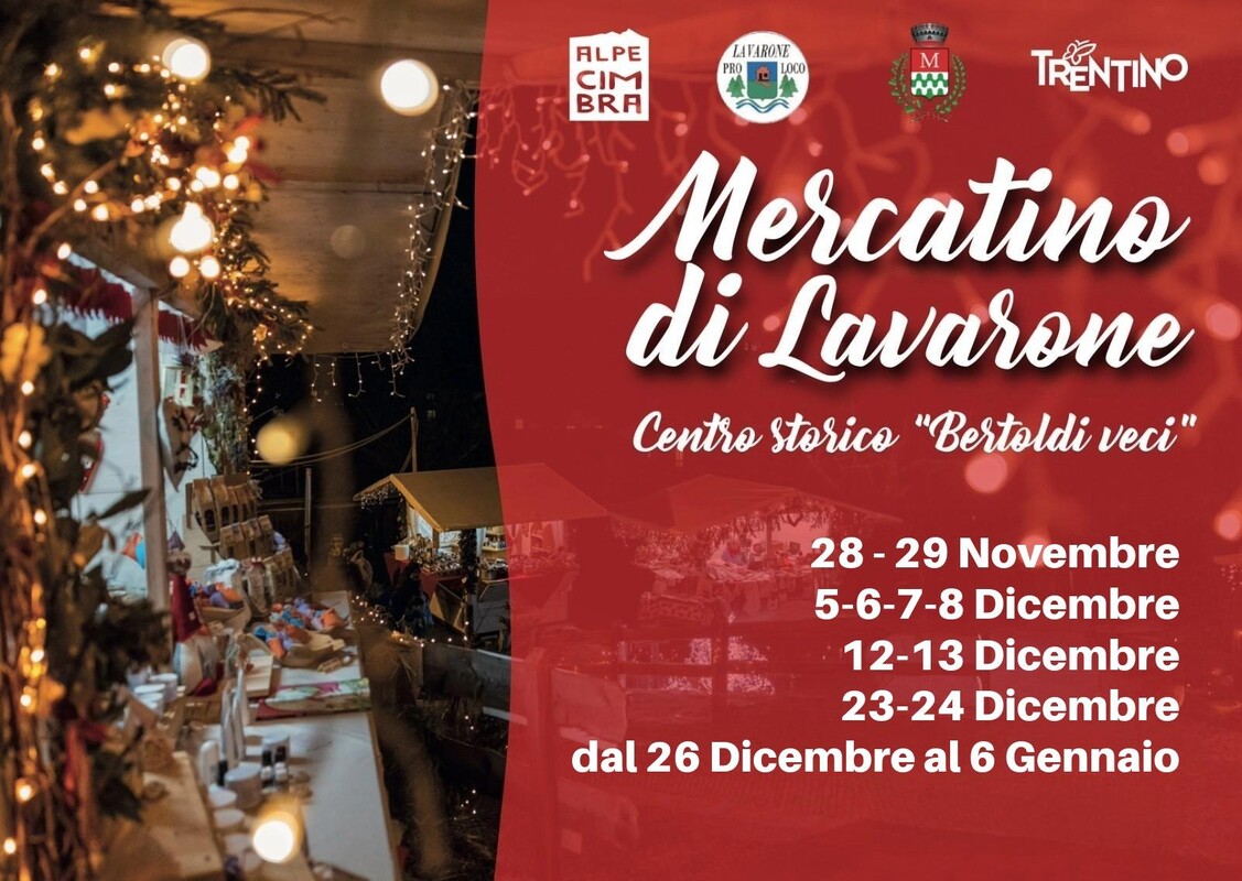 Starting from November 28, in the beautiful setting of the historic center of "Bertoldi veci," the sixth edition of the "Lavarone Market" will take place, organized by the local Pro Loco. Where: Fr. Bertoldi veci When: November 28-29; December 05-06-07-08, December 12-13, December 19-20, December 23-24 and from December 26 to January 06, 2027. Hours: from 11:00 AM to 7:00 PM. More information: APT Alpe Cimbra 0464 724130 info@alpecimbra.it