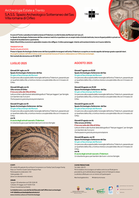 Tra le iniziative, per conoscere curiosità e aspetti inediti si potrà partecipare alle visite guidate “Un giro al Sas al tempo dei Romani”, un percorso in compagnia di un esperto alla scoperta delle meraviglie dell’antica Tridentum, passando per un quartiere della città allo Spazio Sotterraneo del Sas e un’antica vineria nell’area archeologica di Palazzo Lodron, per giungere infine alla splendida villa con il mosaico di Orfeo (24 e 31 luglio, 7, 14, 21 e 28 agosto). Sono dedicati alle famiglie con bambini dai 3 a 6 anni “C’era una volta alla Villa di Orfeo”, letture di libri e albi illustrati della bibliografia di “Nati per leggere” (24 luglio e 21 agosto) e “A caccia degli animali nascosti a Tridentum”, un divertente gioco per bambini a partire dai 6 anni per avvicinare i più piccoli all’affascinante mondo dell’archeologia (31 luglio e 28 agosto).