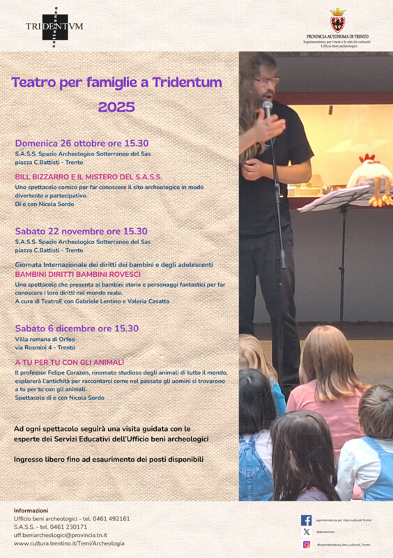 In the archaeological sites of Roman Trento, Teatro per famiglia returns to Tridentum, a fun exhibition that includes three shows aimed at families with children from 4 years of age, proposed by the Educational Services of the Archaeological Heritage Office. The first appointment is on Sunday 26 October at 3.30 pm at the Sas Underground Archaeological Space, in Piazza Cesare Battisti, with Bill Bizzarro and the mystery of the SAS by and with Nicola Sordo. Saturday, November 22 at 3:30 pm, also at the Sas Underground Archaeological Space, as part of the International Day of the Rights of Children and Adolescents, Children's rights, upside-down children will be organized by TeatroE with Irene Buosi and Andrea Deanesi. The exhibition ends at the Roman Villa of Orfeo, on Saturday 6 December at 3.30 pm, with A tu per tu con i animali, an exhilarating show by and with Nicola Sordo. Each appointment, for those who wish, will be followed by a free visit to the site conducted by an expert from the Archaeological Heritage Office. Admission is free until available seats are exhausted.
