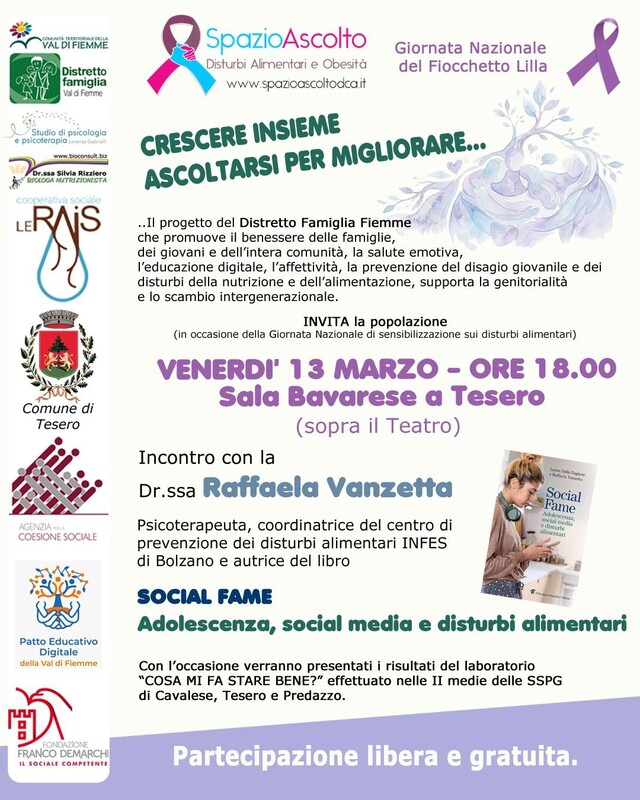 In occasione della Giornata Nazionale di sensibilizzazione sui disturbi alimentari, il progetto del Distretto Famiglia Fiemme invita la popolazione a partecipare all'incontro con la dott.ssa Raffaella Vanzetta, psicoterapeuta, coordinatrice del centro prevenzione dei disturbi alimentari INFES di Bolzano e autrice del libro "Social Fame: adolescenza, social media e disturbi alimentari".